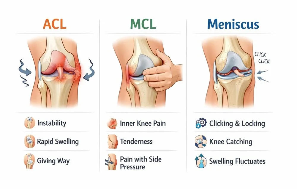 After hearing about all three injuries, it’s normal to feel a bit unsure. A lot of knee symptoms overlap, especially early on. That’s why we don’t rely on just one sign. We look at patterns.